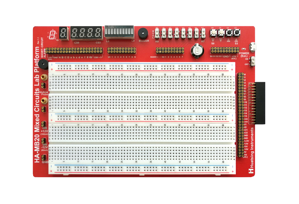 套件中全新的HA-MB20混合電路實(shí)驗(yàn)板增加了高精度大電流±12V電壓源、短路報(bào)警保護(hù)電路以及專(zhuān)用萬(wàn)用表表筆座等模塊,功能與性能全面升級(jí)。